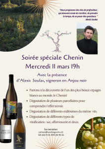 Master Class autour du Chenin, le mercredi 11 mars à 19h avec Alexis Soulas, vigneron en Anjou noir, domaine du Fief noir.